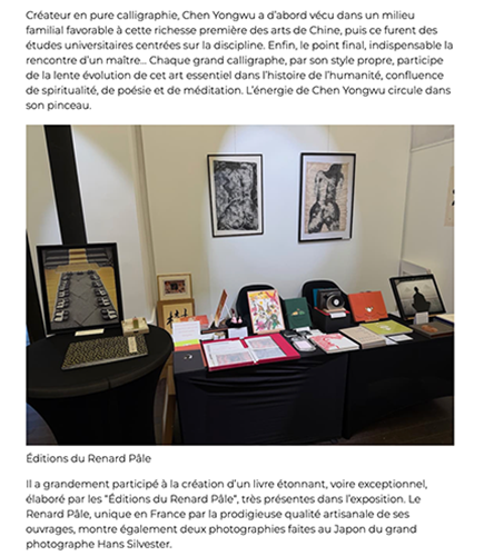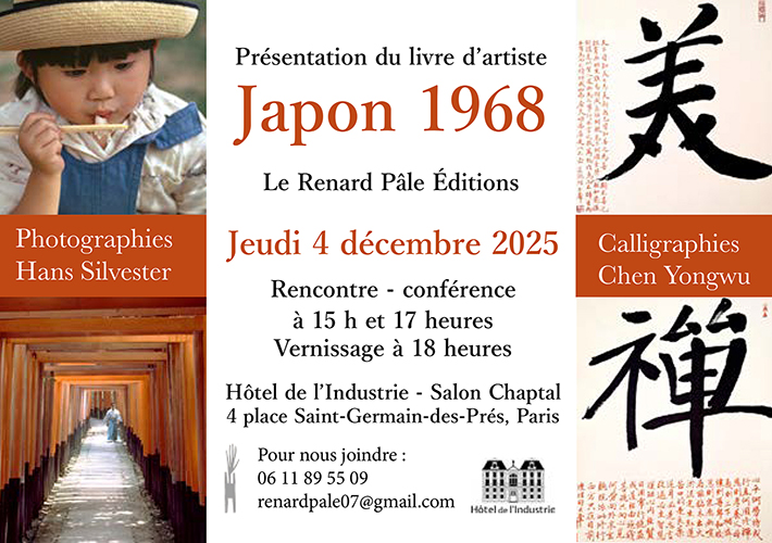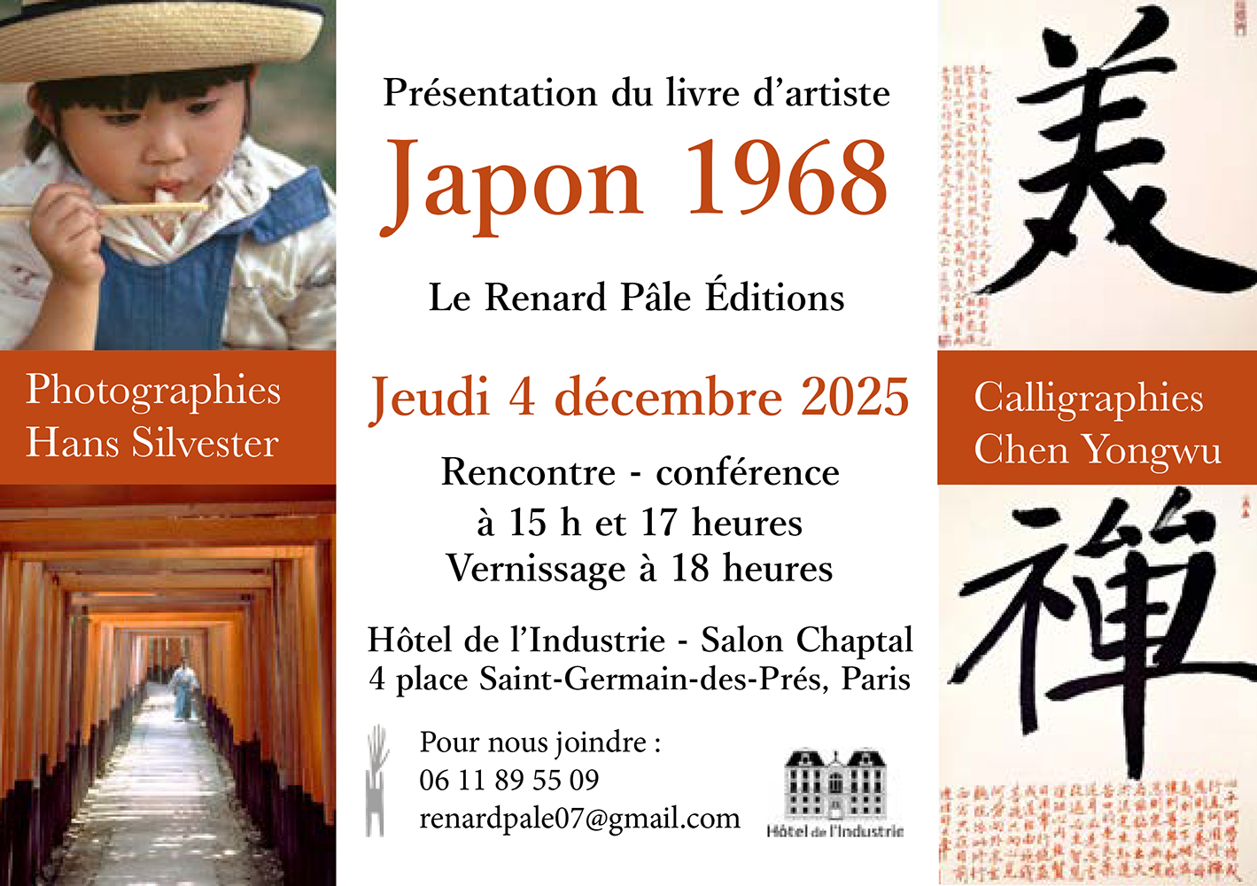 Sur l’initiative de Lala Zang, nous vous accueillerons avec plaisir le jeudi 4 décembre pour une exposition à l’hôtel de l’industrie des artistes Sophie Sainrapt, Gao Wenxiu et du maître calligraphe Chen Yongwu, où nous présenterons le livre d’artiste « Japon 1968 » avec 29 photographies de Hans Silvester prises au Japon en 1968.