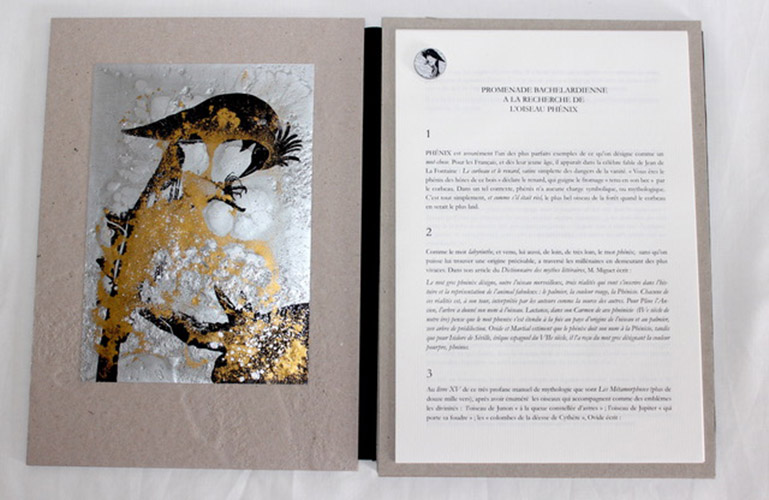 Cette œuvrelivre en hommage à Gaston Bachelard, « LE NID DU PHÉNIX » est composée du poème, « Le Nid du Phénix » et de l’essai « Promenade bachelardienne à la recherche de l’oiseau phénix » de Jean-Clarence Lambert, le tout orné d’une composition originale en technique mixte sur papier métallisé de Bernard Alligand.