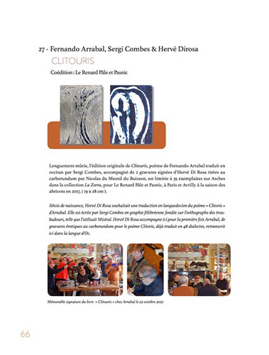 Sont présentés les ouvrages conçus par Patricia Dupuy et Bernard Soria avec Joel-Peter Witkin, Michel Houellebecq, Hans Silvester, Gabriela Morawetz, Felicia Fredon, Katharine Cooper, Henri Maccheroni, Régine Detambel, Marie Rauzy, Fernando Arrabal, Hervé Di Rosa, Mylène Vignon, Sophie Sainrapt, Paella?, Jean-Clarence Lambert, Matine Lafon, Pierre Rabhi, Monique Tello, Mylène Kolé, Aude Ambroggi, Gaston Puel, Mylène Kolé,Bernard Alligand, Marc Desmazières, Corinne Perreaut, Michel Kirch, Shmuel T. Meyer, Pancho Quilici, Chloé Boinnot, Sylvie Durbec et Pierre André Benoit.