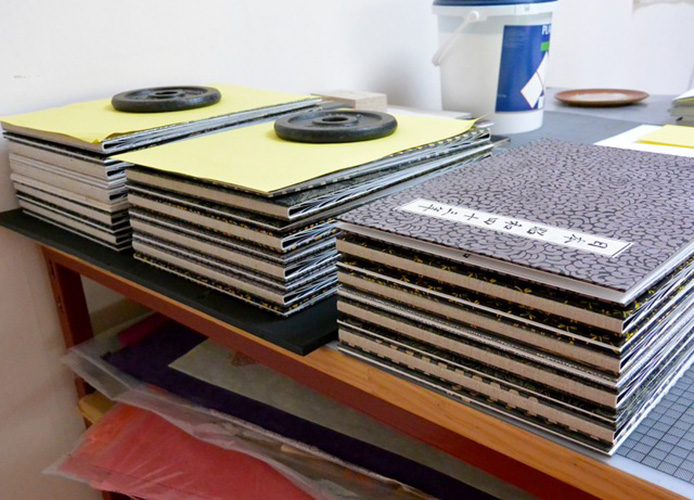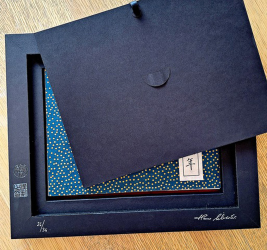 Cet ouvrage est inséré dans un châssis magnétique qui présente en façade une photographie en couleurs tirée par le photographe dans son atelier sur papier Ilford et signée au dos du tableau. Une calligraphie reproduite sur papier Lokta est contrecollée à l’intérieur du châssis. Les sceaux d’Hans Silvester et du Renard Pâle ont été gravés par Maître Guan Qiwei.